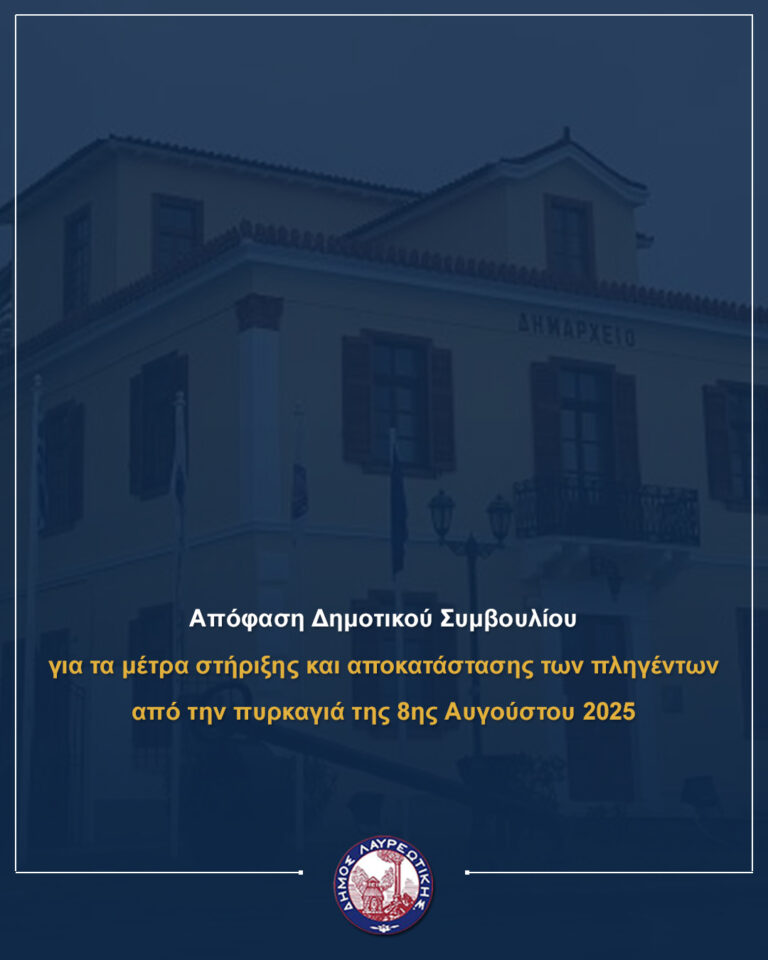 Το Δημοτικό Συμβούλιο Λαυρεωτικής, λαμβάνοντας υπόψη τις εκτεταμένες ζημιές που προκάλεσε η πυρκαγιά της 8ης Αυγούστου 2025, αποφάσισε κατά πλειοψηφία τη λήψη μέτρων για την άμεση στήριξη των πληγέντων και την επαναφορά τους στην κανονικότητα (αρ. απόφ. 101/2025).