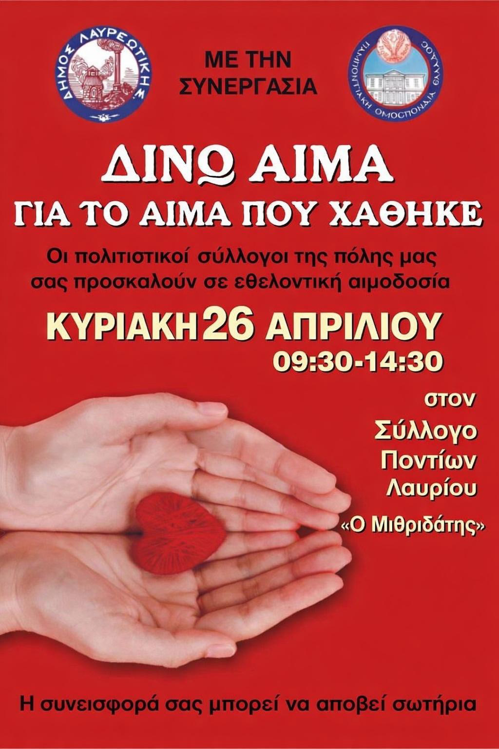 Ο Δήμος Λαυρεωτικής σε συνεργασία με την Παμποντιακή Ομοσπονδία Ελλάδος και τους Πολιτιστικούς Συλλόγους της πόλης σας προσκαλούν να συμμετάσχετε στην εθελοντική αιμοδοσία που θα πραγματοποιηθεί την Κυριακή 26 Απριλίου 2026, 09:30 – 14:30, στο Σύλλογο Ποντίων Λαυρίου «Ο Μιθριδάτης».