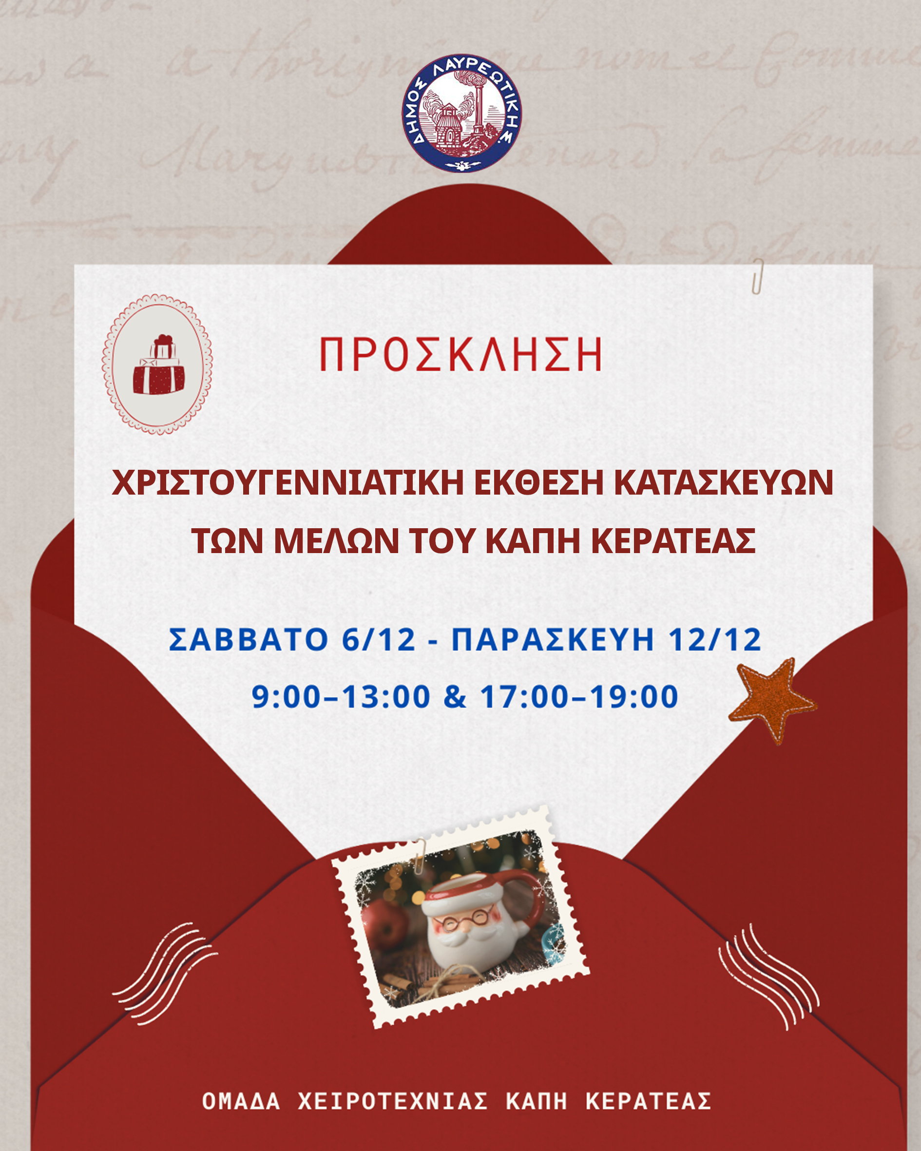 Σας προσκαλούμε στην έκθεση Χριστουγεννιάτικων κατασκευών των μελών του ΚΑΠΗ Κερατέας.