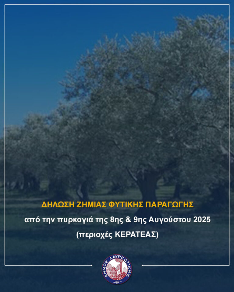 Οι ασφαλισμένοι στον ΕΛΓΑ παραγωγοί που έχουν υποστεί ζημιές σε φυτικό κεφάλαιο στην Κερατέα (Μητροπήσι, Χάρβαλο Μανούτσο, Δημολάκι, Δροσιά, Αρί) μπορούν να υποβάλουν δηλώσεις ζημιάς, εφόσον έχουν καταθέσει Δήλωση Καλλιέργειας ΟΣΔΕ-ΕΛΓΑ έτους 2024 ή 2025.