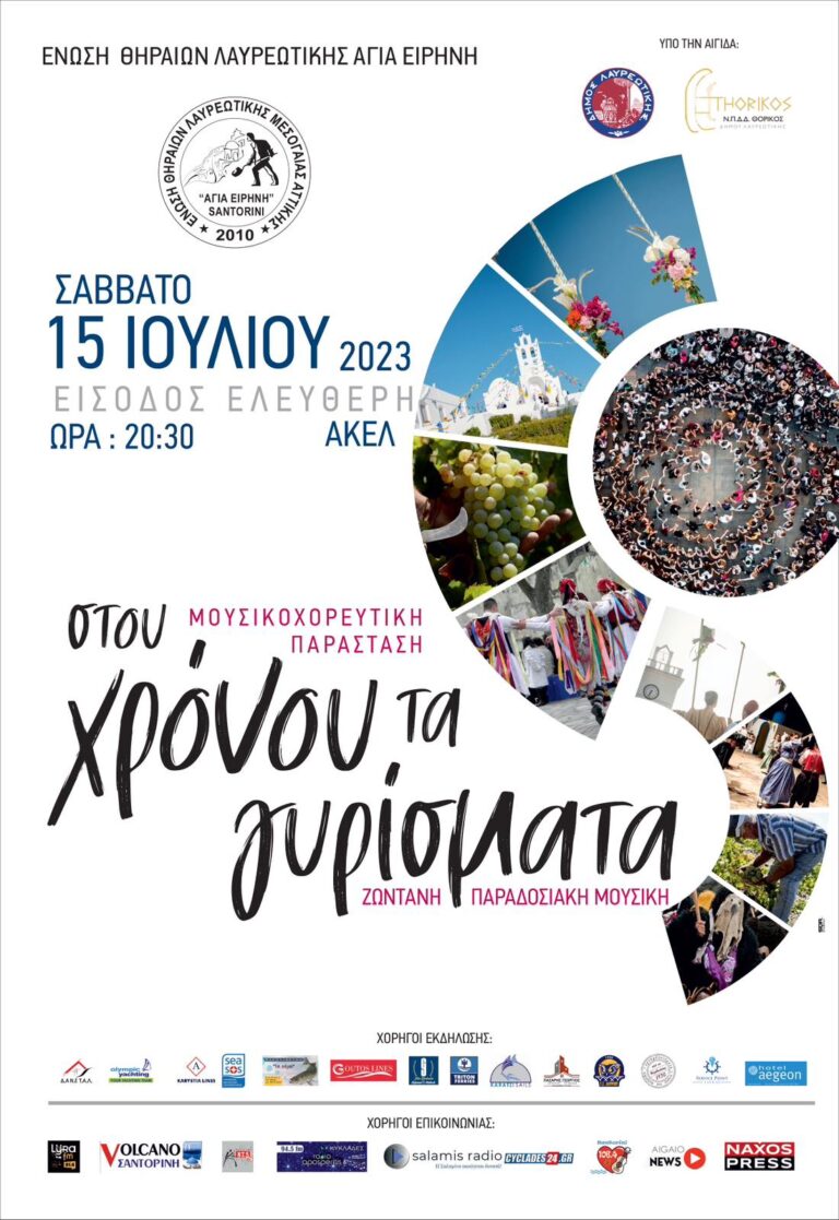 Ο Δήμος Λαυρεωτικής και το Ν.Π.Δ.Δ. «ΘΟΡΙΚΟΣ» σας προσκαλούν στη μουσικοχορευτική παράσταση της Ένωσης Θηραίων Λαυρεωτικής «ΑΓΙΑ ΕΙΡΗΝΗ» που θα πραγματοποιηθεί το Σάββατο 15 Ιουλίου 2023 και ώρα 20:30 στην ΑΚΕΛ.
