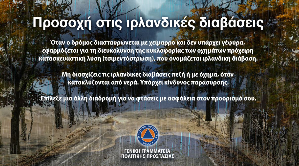 - Μην διασχίζετε μια ιρλανδική διάβαση πεζή ή με όχημα, όταν κατακλύζεται από νερά. Υπάρχει κίνδυνος για τη ζωή σας!
