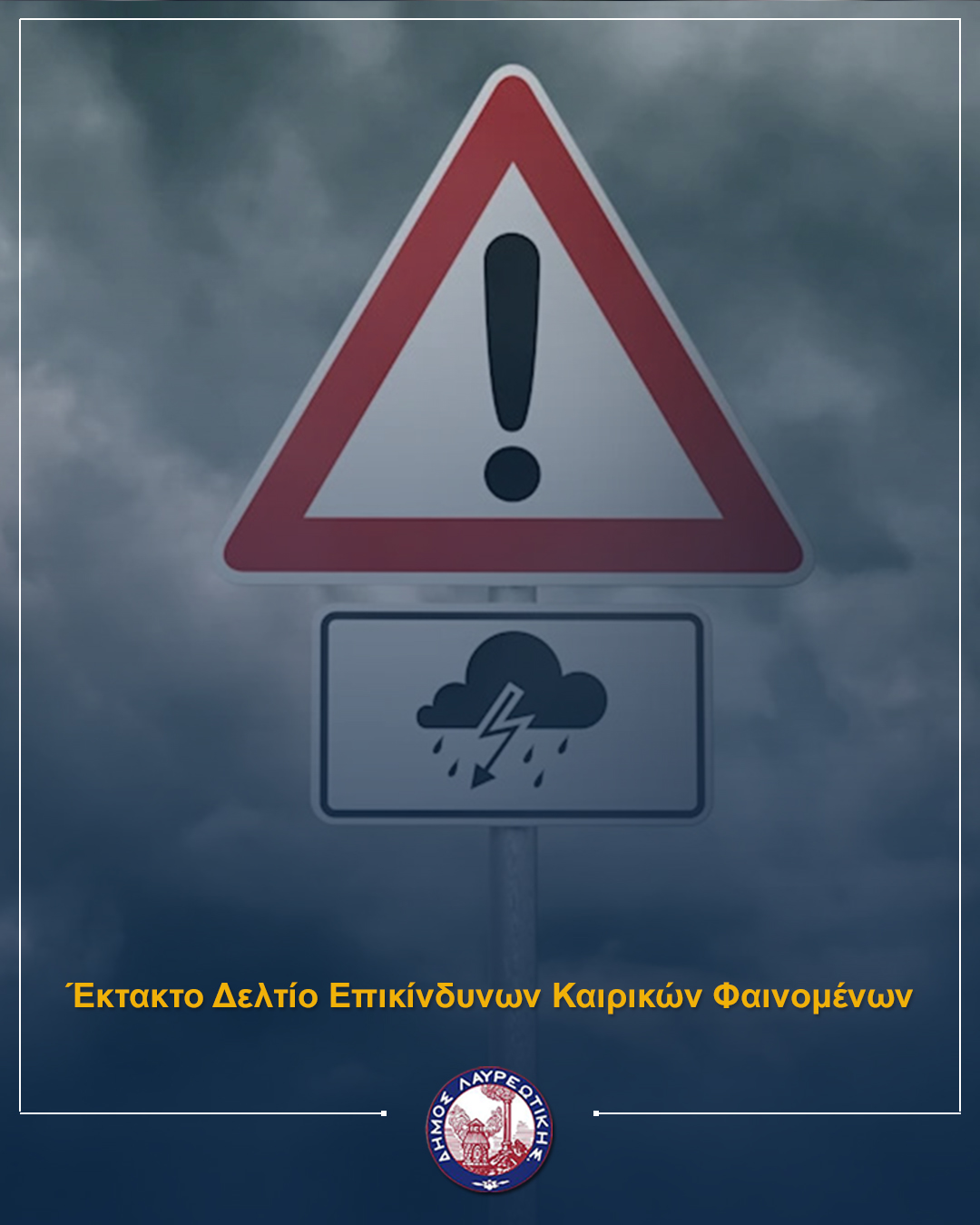 Ο Δήμος Λαυρεωτικής ενημερώνει τους πολίτες ότι σύμφωνα με το Έκτακτο Δελτίο Επικίνδυνων Καιρικών Φαινομένων που εκδόθηκε από την Εθνική Μετεωρολογική Υπηρεσία, προβλέπεται να επικρατήσει κακοκαιρία η οποία θα επηρεάσει την περιοχή της Αττικής την Τετάρτη 21.01.2026 και την Πέμπτη 22.02.2026, με κύρια χαρακτηριστικά τις ισχυρές βροχές και καταιγίδες και τους κατά τόπους θυελλώδεις ανέμους.