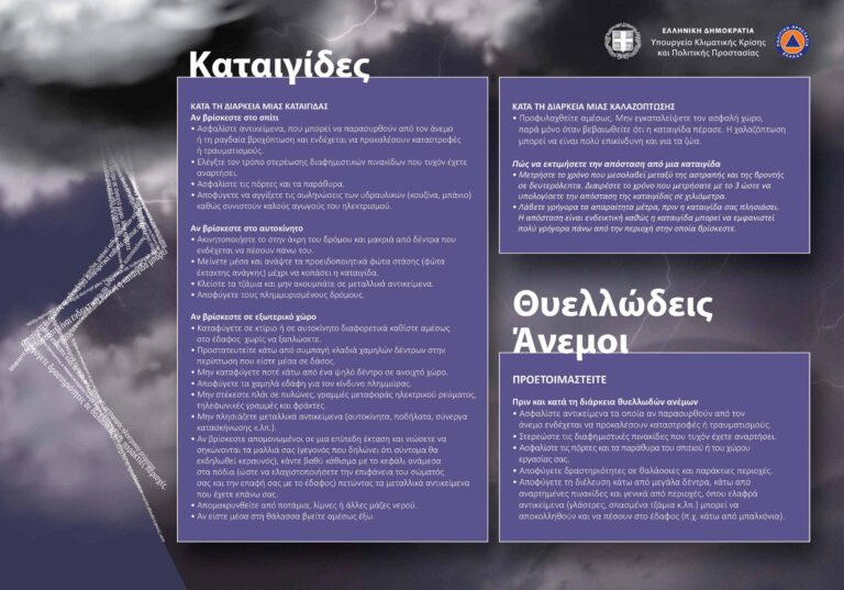 Εξίσου σημαντική είναι η λήψη μέτρων αυτοπροστασίας από κινδύνους που προέρχονται από την εκδήλωση των έντονων καιρικών φαινομένων, ενώ συστήνουμε μεγάλη προσοχή στους κατοίκους των πυρόπληκτων περιοχών.