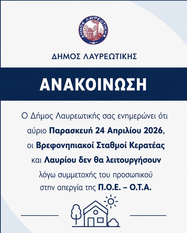 Ο Δήμος Λαυρεωτικής σας ενημερώνει ότι αύριο Παρασκευή 24 Απριλίου 2026, οι Βρεφονηπιακοί Σταθμοί Κερατέας και Λαυρίου δεν θα λειτουργήσουν λόγω συμμετοχής του προσωπικού στην απεργία της Π.Ο.Ε. – Ο.Τ.Α.