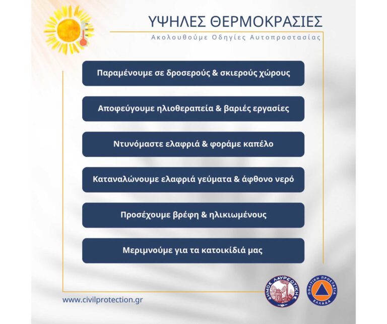 Ο Δήμος Λαυρεωτικής συστήνει στους πολίτες να ακολουθήσουν τις κάτωθι οδηγίες προστασίας λόγω των πολύ υψηλών θερμοκρασιών που αναμένονται να επηρεάσουν την περιοχή μας: