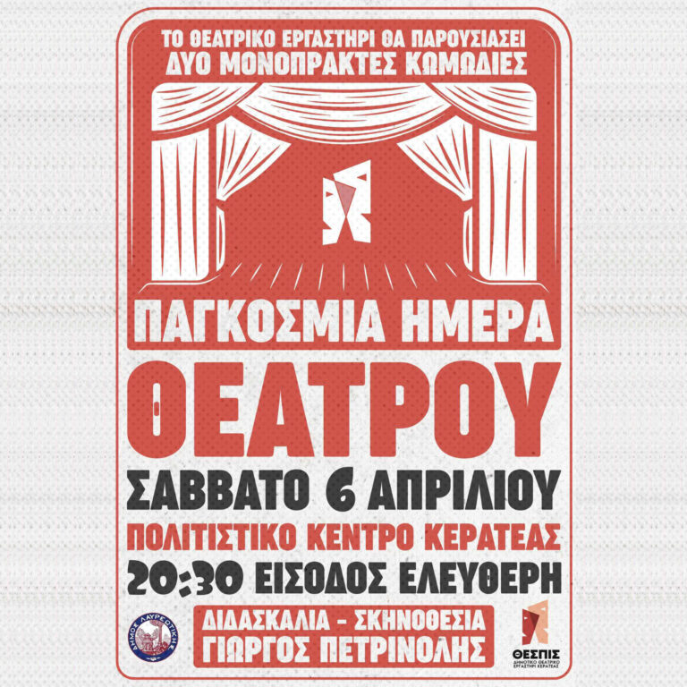 Το Δημοτικό θεατρικό εργαστήρι Κερατέας «ΘΕΣΠΙΣ» θα παρουσιάσει δύο μονόπρακτες κωμωδίες το Σάββατο 6 Απριλίου στις 8:30 μμ στο Πολιτιστικό Κέντρο Κερατέας.