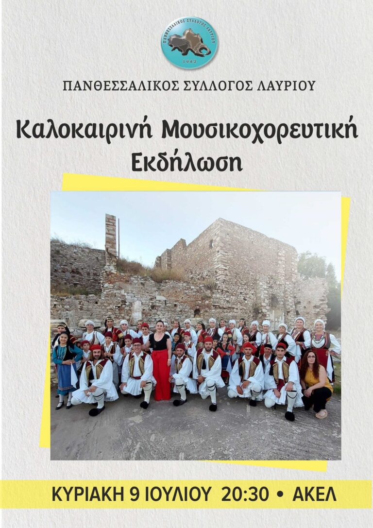 Ο Δήμος Λαυρεωτικής και το Ν.Π.Δ.Δ. «ΘΟΡΙΚΟΣ» σας προσκαλούν στη μουσικοχορευτική εκδήλωση του Πανθεσσαλικού Συλλόγου Λαυρίου που θα πραγματοποιηθεί την Κυριακή 9 Ιουλίου 2023 και ώρα 20:30 στην ΑΚΕΛ.