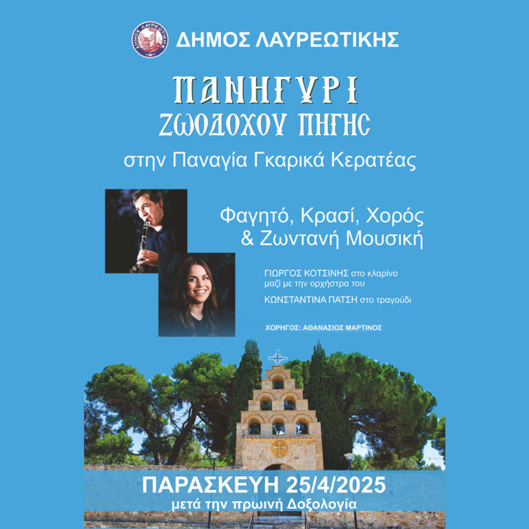 Ο Δήμος Λαυρεωτικής σας προσκαλεί στο παραδοσιακό πανηγύρι της Ζωοδόχου Πηγής, την Παρασκευή 25 Απριλίου 2025, στον προαύλιο χώρο της Παναγίας Γκαρικά στην Κερατέα, αμέσως μετά την πρωινή δοξολογία.