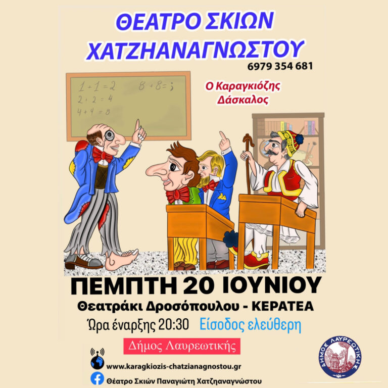 Παράσταση θεάτρου σκιών «ο Καραγκιόζης δάσκαλος» στο θεατράκι Δροσοπούλου στην Κερατέα την Πέμπτη 20 Ιουνίου στις 8:30 μμ