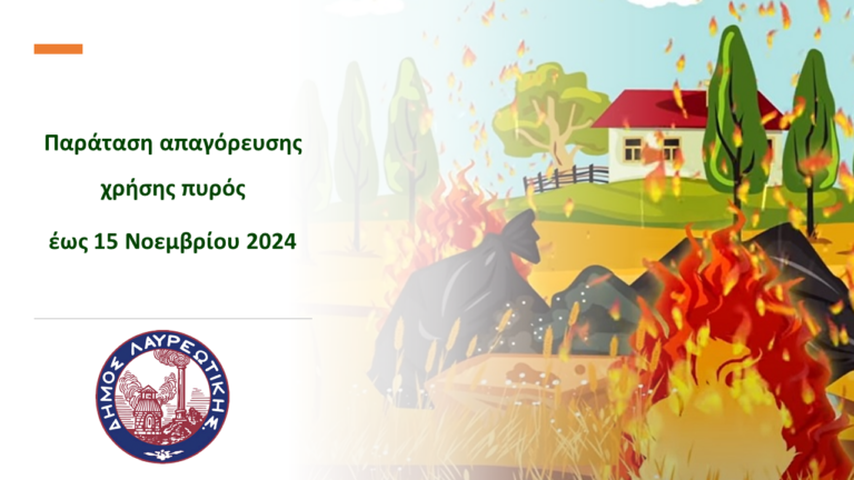 Σας ενημερώνουμε ότι παρατείνεται η απαγόρευση χρήσης πυρός στις εκτάσεις του Δήμου Λαυρεωτικής έως και τις 15 Νοεμβρίου 2024, σύμφωνα με την υπ’ αριθμ. 2031 Φ.702.15/2024 (ΦΕΚ 6016/τ.Β΄/ 30.10.2024) του Συντονιστή Επιχειρήσεων Αττικής.