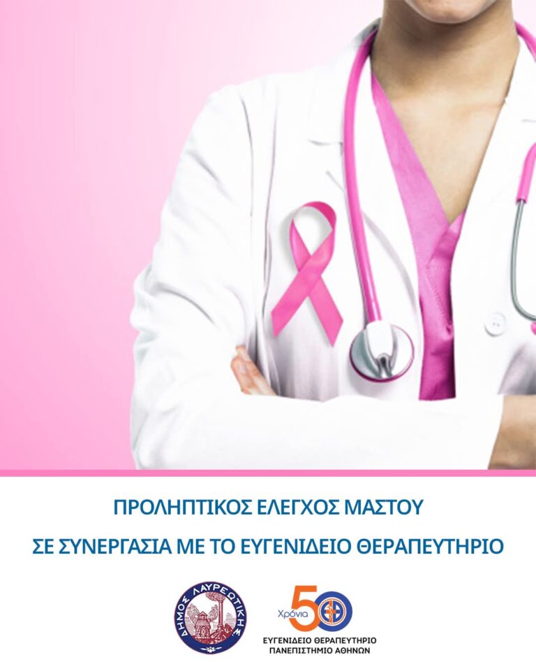 Ο Δήμος Λαυρεωτικής σε συνεργασία με το Ευγενίδειο Θεραπευτήριο, παρέχει στους δημότες και τις γυναίκες υπαλλήλους του Δήμου μας ένα ειδικό πακέτο προληπτικού ελέγχου μαστού.