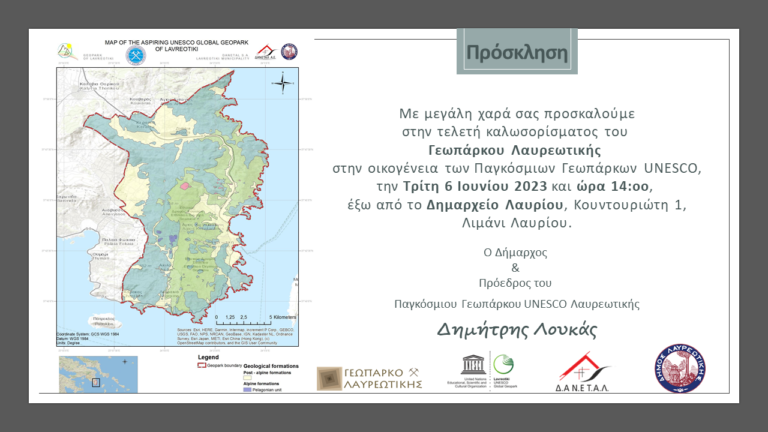 Με μεγάλη χαρά σας προσκαλούμε στην τελετή καλωσορίσματος του Γεωπάρκου της Λαυρεωτικής στην οικογένεια των Παγκόσμιων Γεωπάρκων UNESCO, η οποία θα πραγματοποιηθεί στον εξωτερικό χώρο του Δημαρχείου του Λαυρίου, την Τρίτη 6 Ιουνίου 2023 & ώρα 2:00 μ.μ.