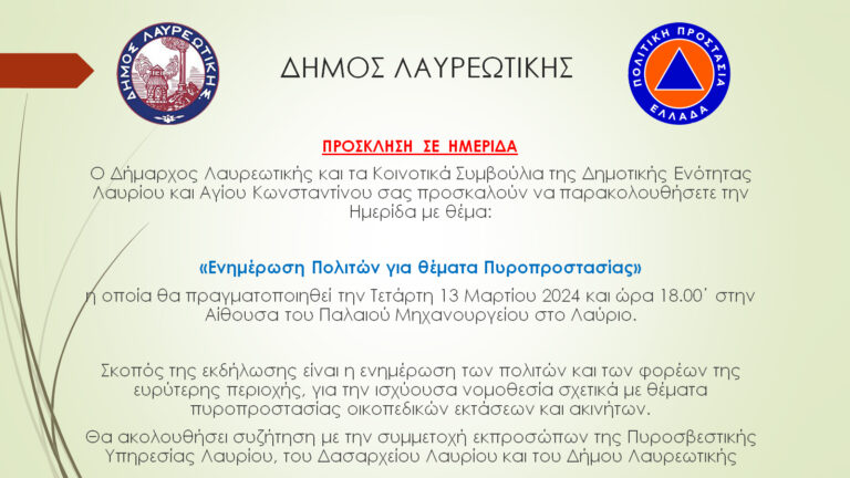 Σας γνωρίζουμε ότι ο Δήμος Λαυρεωτικής και τα Κοινοτικά Συμβούλια της Δημοτικής Ενότητας Λαυρίου και Αγίου Κωνσταντίνου, διοργανώνουν ΗΜΕΡΙΔΑ με θέμα «Ενημέρωση Πολιτών για θέματα Πυροπροστασίας» η οποία θα πραγματοποιηθεί την Τετάρτη 13/03/2024 και ώρα 18:00 στην αίθουσα του Παλαιού Μηχανουργείου στο Λαύριο.