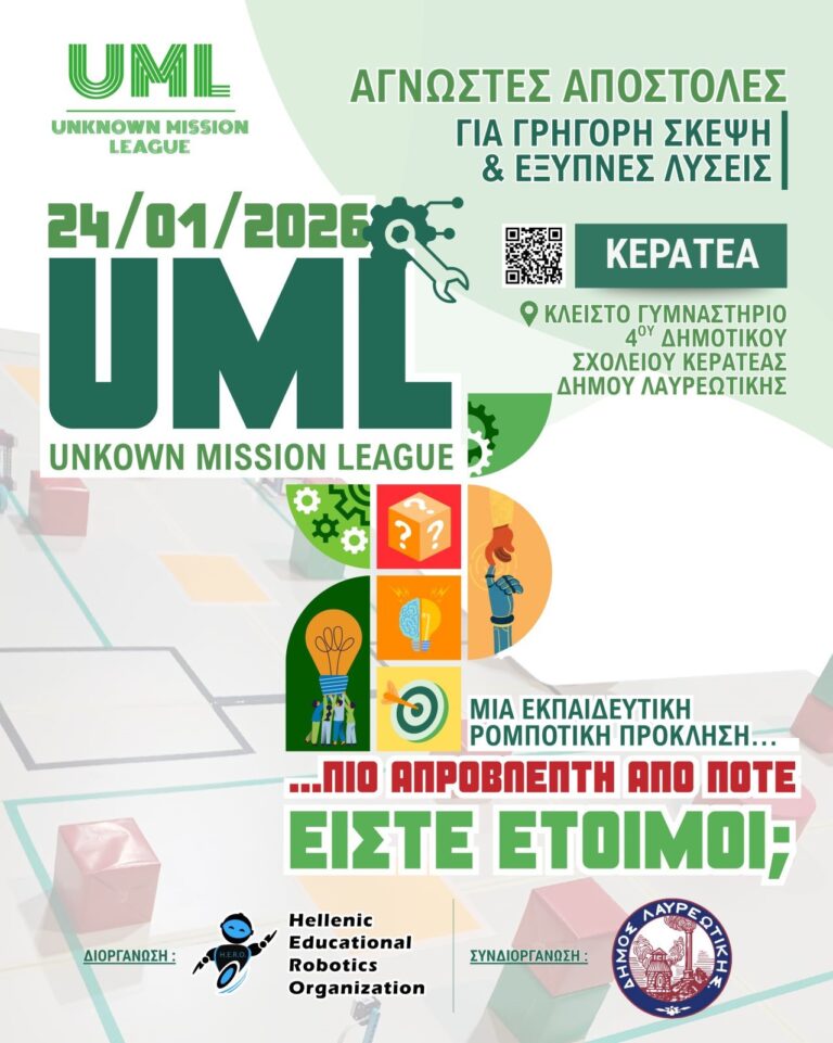 Το Σαββατοκύριακο 24 και 25 Ιανουαρίου 2026, στο Κλειστό Γυμναστήριο του 4ου Δημοτικού Σχολείου Κερατέας, θα διεξαχθούν για πρώτη φορά στη Λαυρεωτική οι διαγωνισμοί Unknown Mission League και Robofest Hellas.