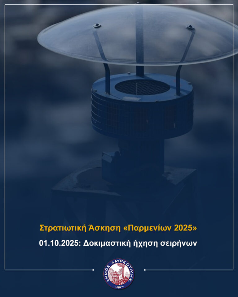 Ο Δήμος Λαυρεωτικής ενημερώνει τους πολίτες ότι την Τετάρτη 1 Οκτωβρίου 2025 θα πραγματοποιηθεί δοκιμαστική ενεργοποίηση του Συστήματος Έγκαιρης Προειδοποίησης Άμαχου Πληθυσμού σε όλη την επικράτεια στο πλαίσιο της διακλαδικής άσκησης μεγάλης κλίμακας, ΤΑΜΣ «ΠΑΡΜΕΝΙΩΝ-2025».