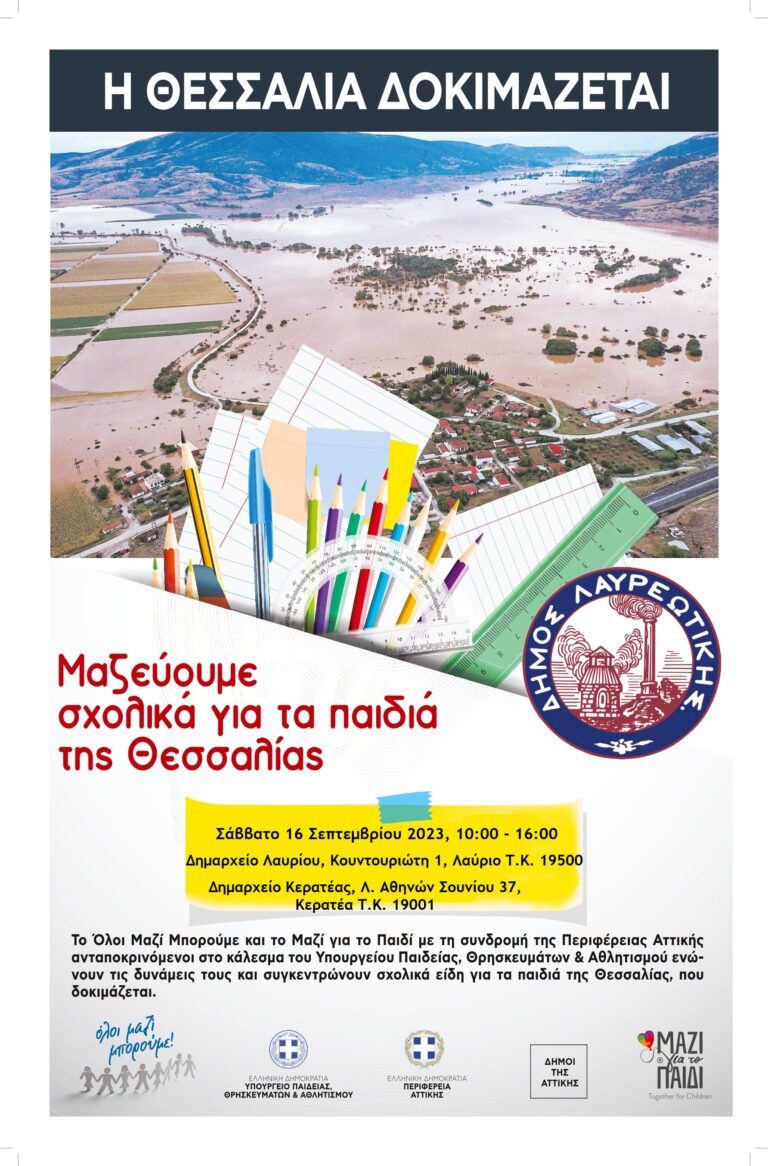 Ο Δήμος Λαυρεωτικής σε συνεργασία με το Όλοι Μαζί Μπορούμε καλούν τους Δημότες να προσφέρουν σχολικά είδη στα παιδιά της Θεσσαλίας, που δοκιμάζεται.