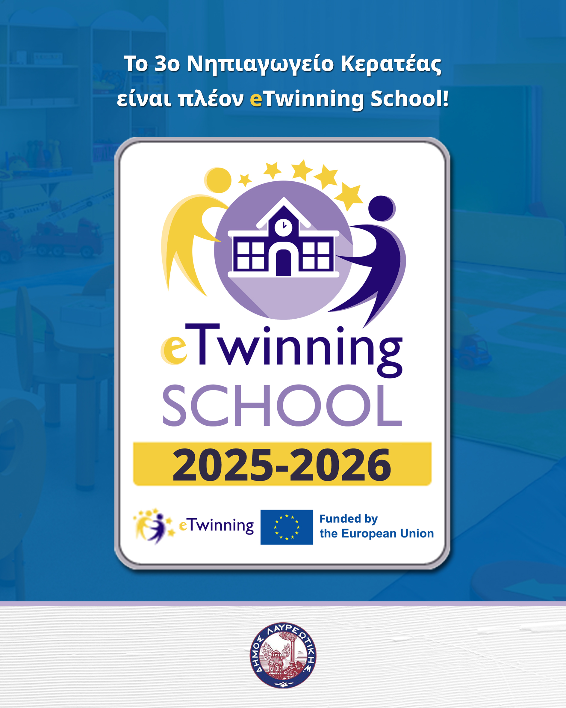 Με ιδιαίτερη χαρά συγχαίρουμε τη διεύθυνση και το εκπαιδευτικό προσωπικό του 3ου Νηπιαγωγείου Κερατέας για τη σημαντική διάκριση eTwinning School, μια αναγνώριση που επιβεβαιώνει το υψηλό επίπεδο καινοτομίας, συνεργασίας και παιδαγωγικής ποιότητας.