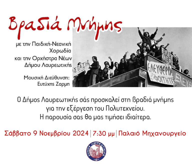 Ο Δήμος Λαυρεωτικής σάς προσκαλεί στη γιορτή τιμής & μνήμης της εξέγερσης του Πολυτεχνείου.
