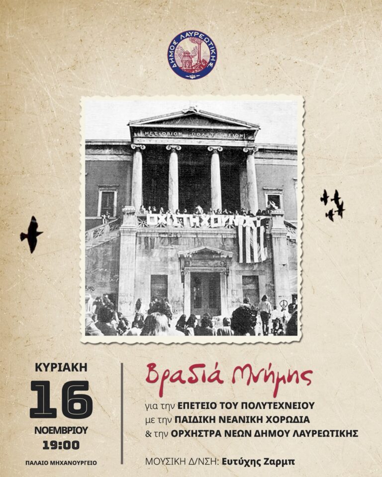 Ο Δήμος Λαυρεωτικής σάς προσκαλεί σε μια ξεχωριστή γιορτή τιμής και μνήμης για την Εξέγερση του Πολυτεχνείου, με τη συμμετοχή της Παιδικής – Νεανικής Χορωδίας και της Ορχήστρας Νέων Δήμου Λαυρεωτικής, υπό τη μουσική διεύθυνση του Ευτύχη Ζαρμπ.